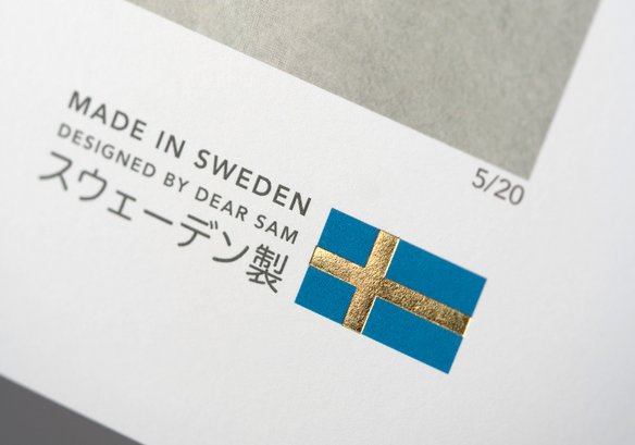 Alla våra motiv i denna serie kommer med ett unikt emblem och en präglad logga. Pappret är designat och framtaget specifikt för Studio Dear Sam kollektionen. Till alla Studio Dear Sam motiv i limiterad upplaga medföljer ett unikt och signerat certifikat som bl.a. intygar motivets äkthet och aktuell upplaga.